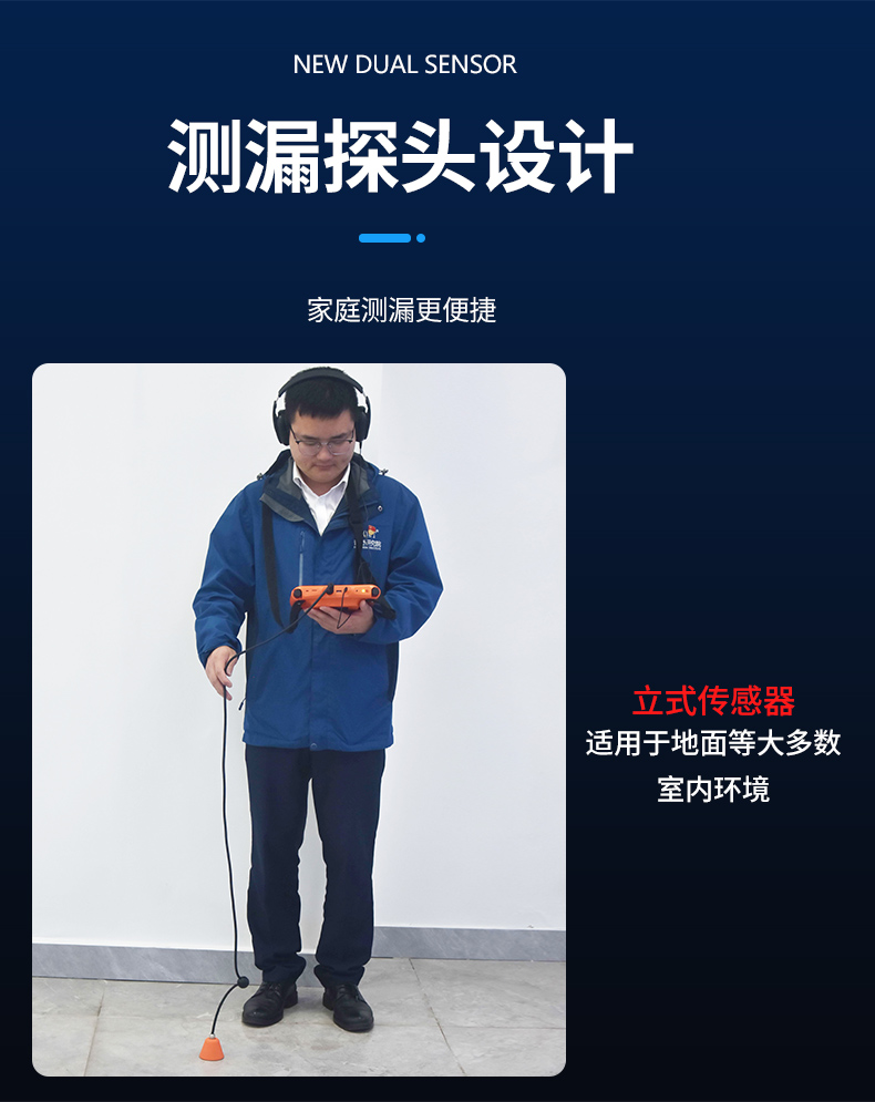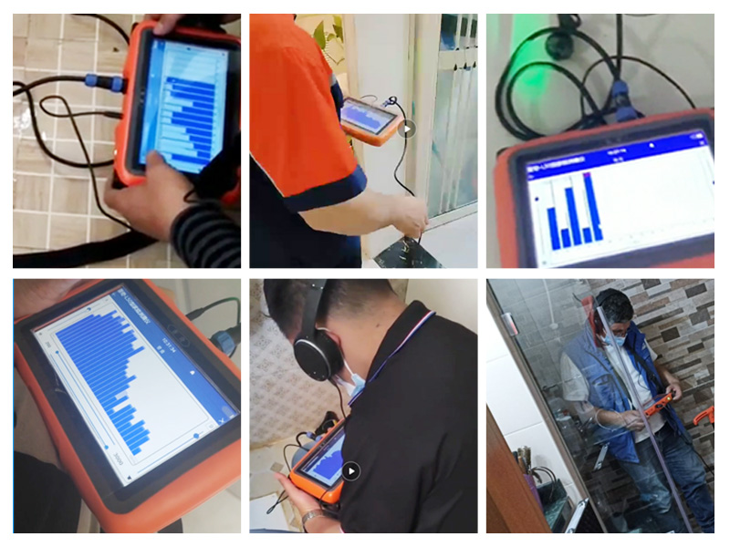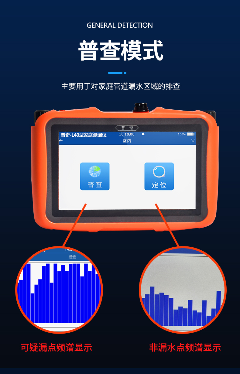 普奇L40家庭管道漏水檢測(cè)儀通過(guò)傳感器將漏水聲音信號(hào)進(jìn)行采集,采集后的信號(hào)通過(guò)主機(jī)處理,以可視化頻譜及信號(hào)柱的方式顯示在主機(jī)屏幕上,同時(shí)聲音也會(huì)通過(guò)主機(jī)輸出到耳機(jī),通過(guò)“聽(tīng)”、“看”兩種方式結(jié)合,分析判斷漏水點(diǎn)。“普查模式”+“定位模式”雙重鎖定漏水點(diǎn),能夠精準(zhǔn)、快速、有效的解決各類家庭管道的漏水問(wèn)題。