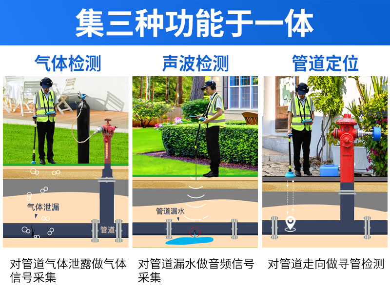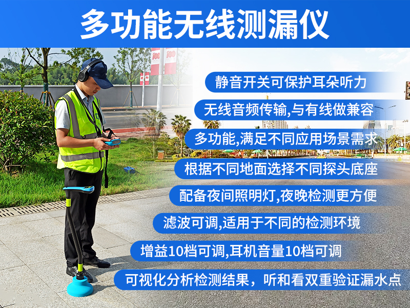 PQ-BT30 系列多功能無線測漏儀是我院自主研發,集氣體檢測、聲波檢測、尋管定位三種功能于一體的新一代多功能無線測漏儀,該系列儀器一方面通過對漏損處聲音信號或管道泄漏處氣體的采集分析,有效便捷的解決外網壓力管道的漏損難題,另一方面通過在管道接口處安裝發聲裝置,還可精確定位地下金屬及非金屬管道的位置及走向,適用于 外網自來水、消防、供暖管道的漏損和管道走向的檢測及巡查。