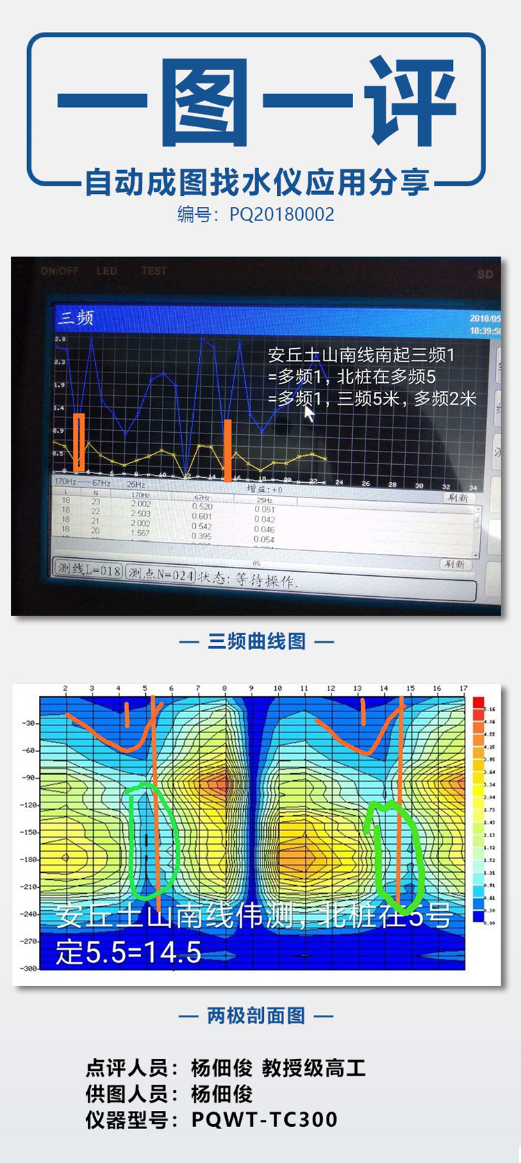 這是在灰巖出露的大斷層的實測圖。三頻12為空測,向右是復測,3=15點正對對層,反映明顯。多頻9點空測,向右復測,4=13點正對斷層,一致性好。預計靜水位60米,5點6點對應14點15點,100米以下有明顯低值反映,反應程度大大強于單純的低值下傳,應是裂隙好的表現。實打在5.5=14.5點,到47米就因跑風嚴重被迫停鉆。證明天電可以找出好斷層。