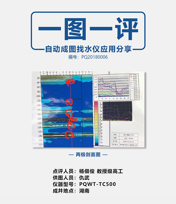 該圖屬于“水平多層,水量濤濤”圖形。圖中標出了5層有黑邊的水平高值層,各測點都有顯示,呈電性差異很明顯的高低值互層,分析認為各層的接觸面都有水,打哪個點都行。為爭取水量更好,我選擇了高低值差異更明顯的10號點。經實打,39米見水,到220米水量已達200方/天,大獲成功。