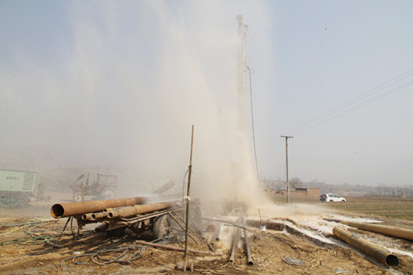 4、將潛水泵放置在井機附近的水井或其他水源中,用水管將潛水泵與壓頭連接。用于鉆井時沖洗泥漿。